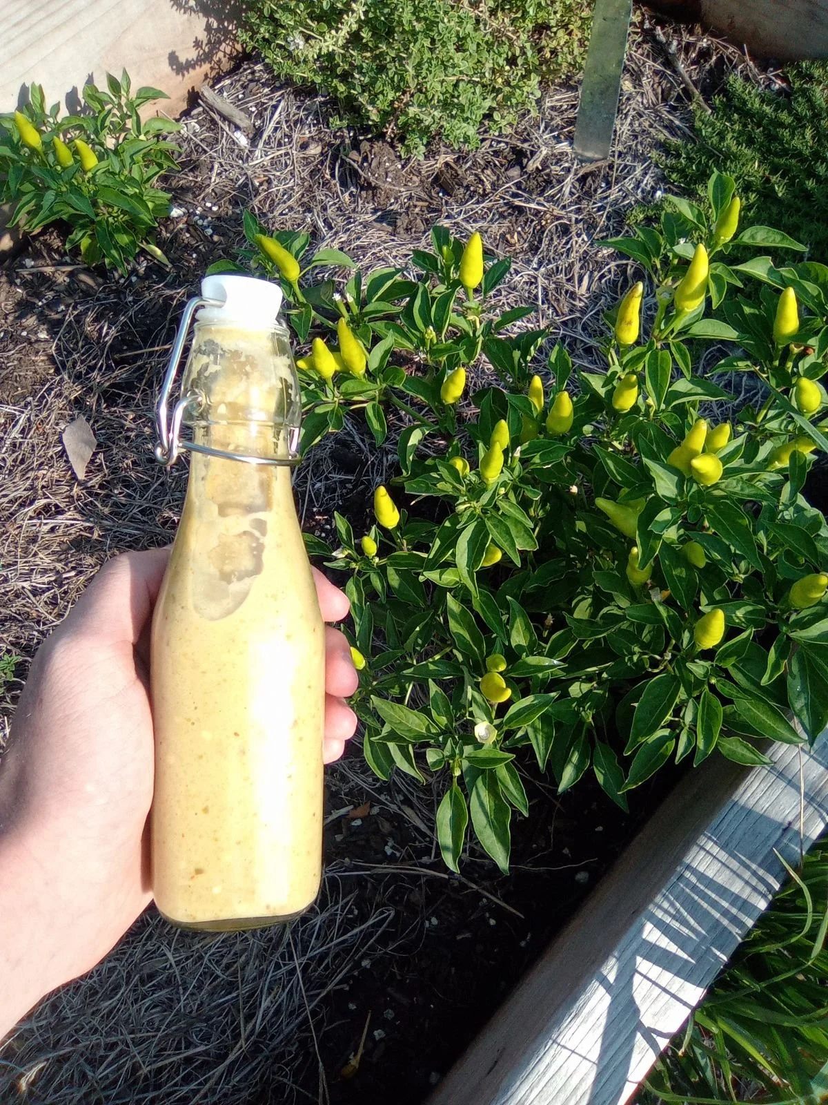 Preserve everything in the garden, nothing goes to waste or rot. What doesn’t make it into hot sauce gets dried out in the sun until brittle. Use a needle and thread and sew through the stems. These are then ground up in my spice grinder and added to a homemade Cajun seasoning mix. If you don’t have time for hot sauce or seasoning, freeze them for a later date. The acidic vinegar-based sauce lasts a long time in a jar on the shelf or in the fridge. I’ve never had one go bad, it gets eaten so quickly, the kids love it!